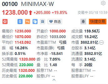 上证报中国证券网讯(记者 杨子晏)3月18日午后,MINIMAX-W持续走高。截至13时59分,MINIMAX-W涨19.85%,报1238港元/股,成交额约18.24亿港元,总市值约3882.81亿港元。港股大模型概念股智谱同样走强,涨逾13%。