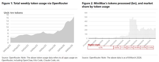 从厂商自身数据来看,增速同样触目惊心:MiniMax披露,2026年2月其M2系列文本模型日均Token消耗量较2025年12月暴增超过6倍,其中编程计划(coding plan)的Token消耗更猛增10倍以上。MiniMax M2.5于2026年2月11日发布,12小时内即登上OpenRouter人气榜榜首,发布后一周内单周Token使用量即跳升至3万亿,超过Kimi K2.5、GLM-5和DeepSeek V3.2三家之和。