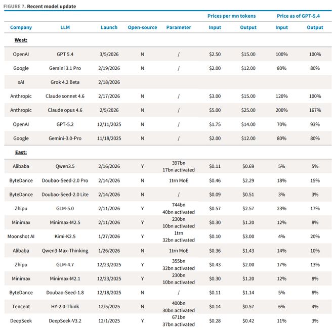 据巴克莱研究数据(截至2026年3月9日),中国主流AI模型的输出定价普遍低于OpenAI GPT-5.4的20%,大多数甚至不足10%: